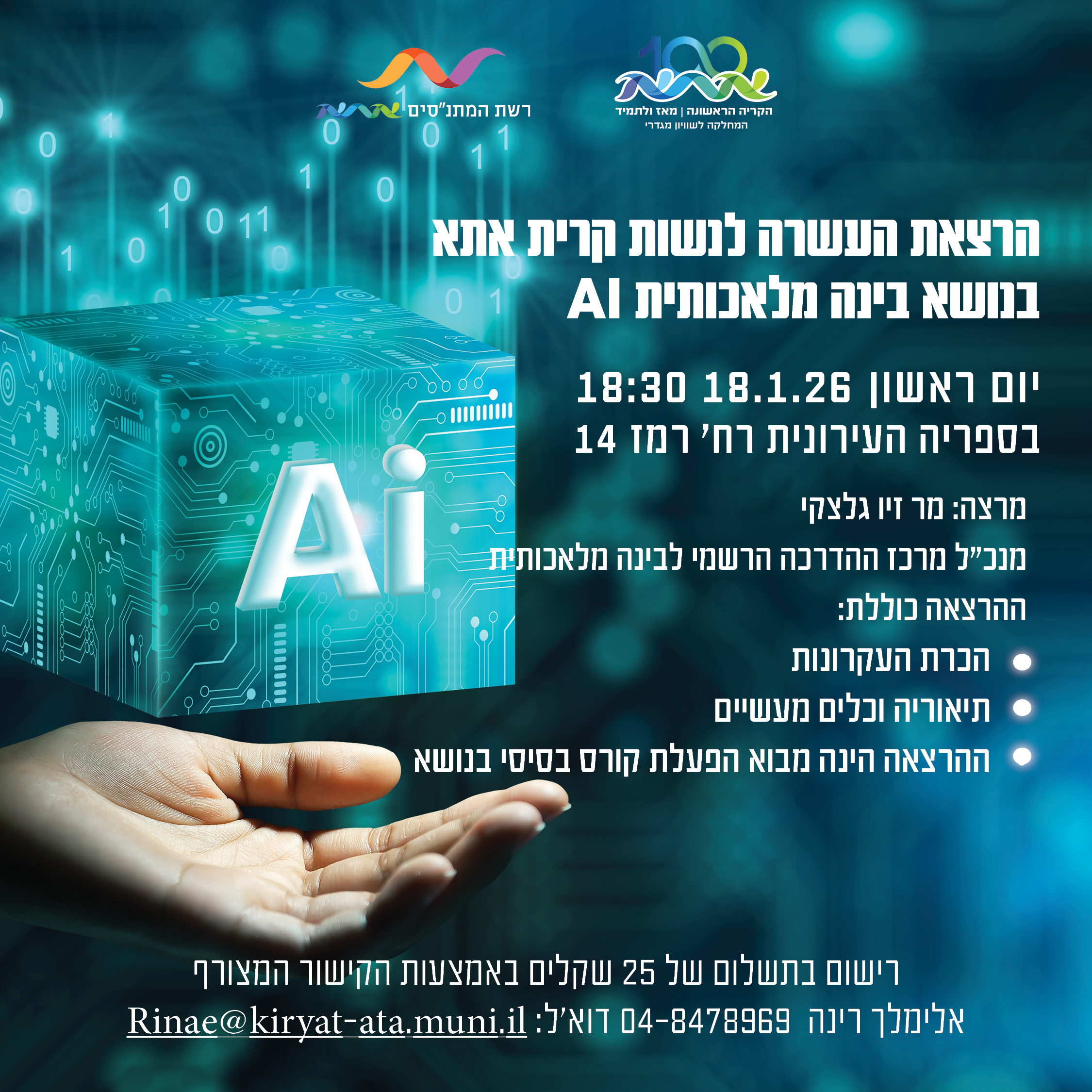 נשות העיר מוזמנות להשתתף בהרצאה בנושא "הבינה המלאכותית" כהערכות לטכנולוגיה החדשה המחקה את האינטיליגנציה האנושית בביצוע משימות.